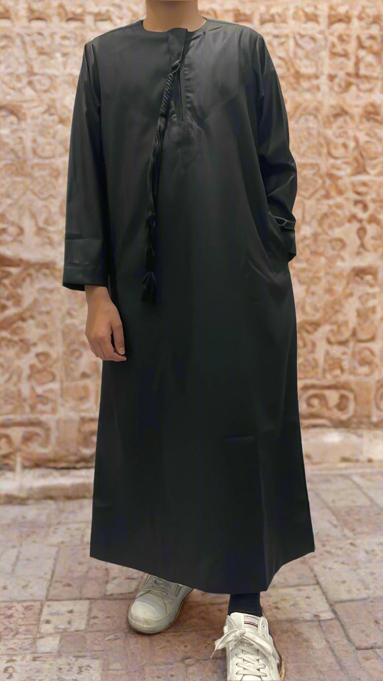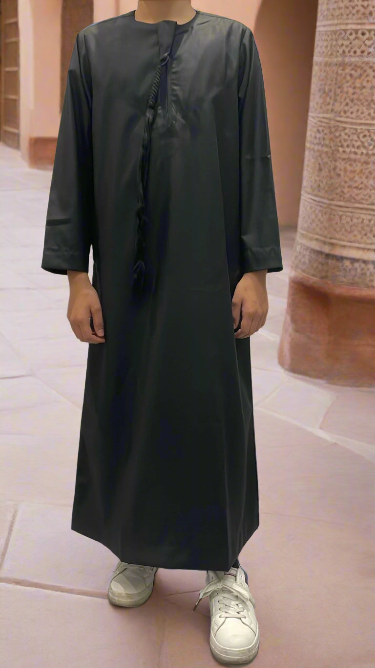 Black Matte Omani Thobe by Qamar Clothing UK, a timeless garment that seamlessly blends tradition with contemporary style. Crafted from premium 100% polyester, this thobe boasts a luxurious Black matte hue that exudes sophistication. Designed for casual wear, it offers both comfort and elegance in equal measure. Whether you're attending a gathering or simply going about your day, this thobe ensures you make a statement with its refined simplicity. Plus, with its machine washable fabric, caring for this garment is effortless, adding practicality to its charm.