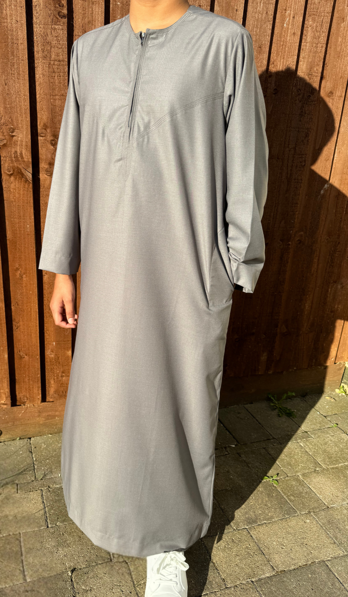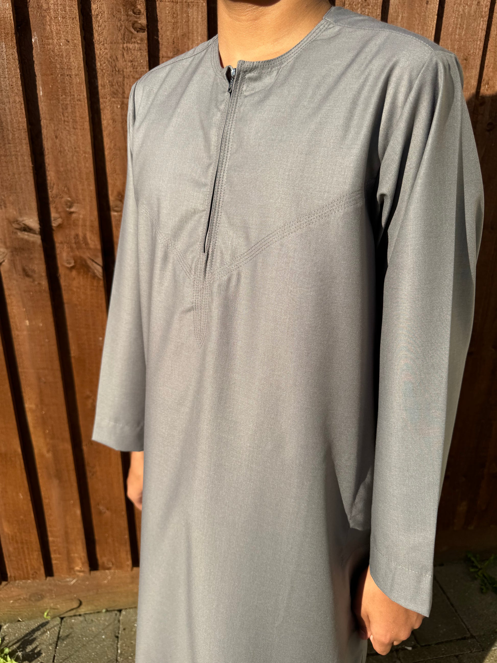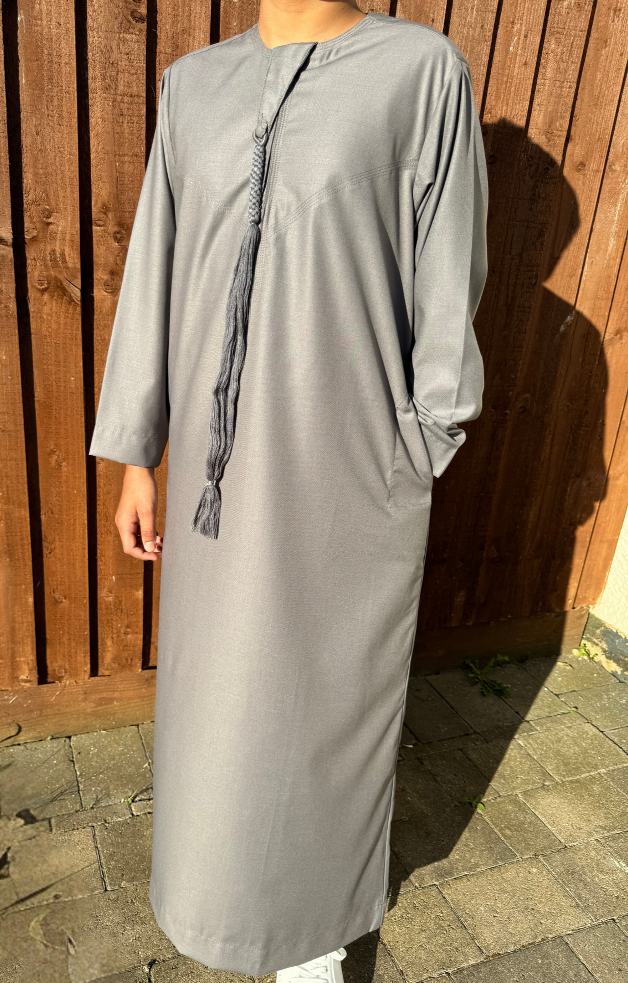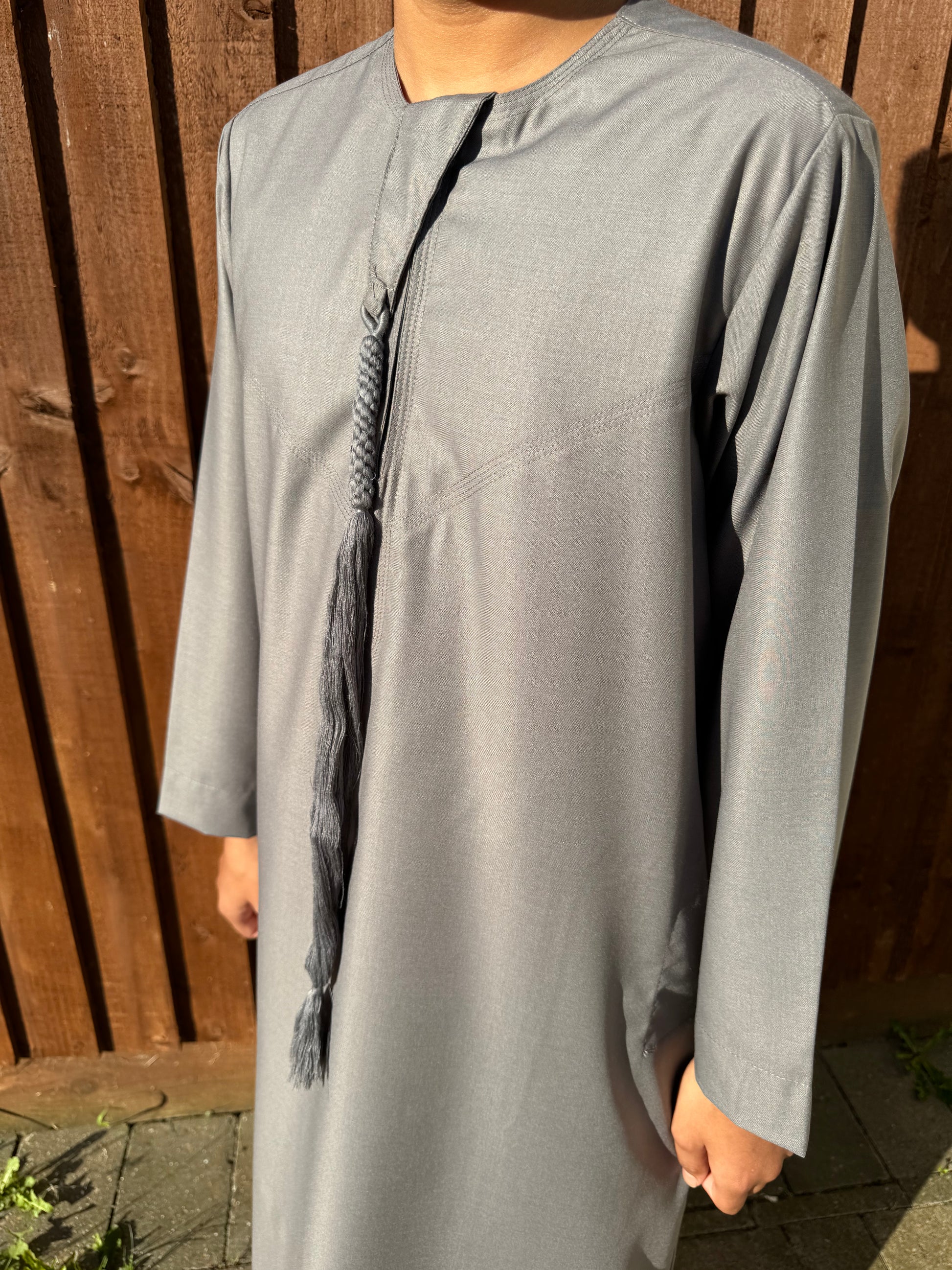 Grey Matte Omani Thobe with Tassel by Qamar Clothing UK, a distinguished garment blending timeless tradition with contemporary sophistication. Skillfully crafted from premium materials, this thobe showcases a deep grey matte finish, adorned with a stylish tassel accent for added flair. Perfect for both casual and formal occasions, it exudes effortless elegance while ensuring comfort. Its durable fabric is easy to maintain, making this thobe a practical yet stylish choice for any wardrobe.