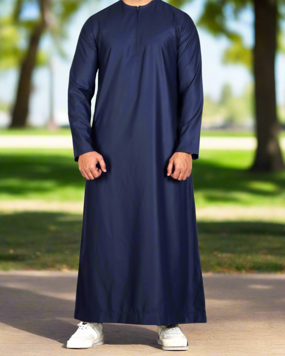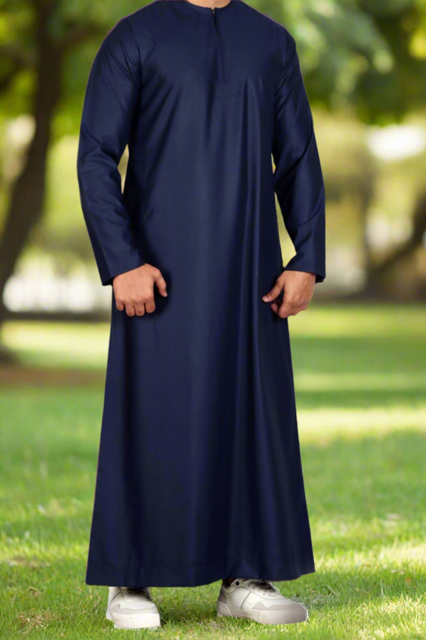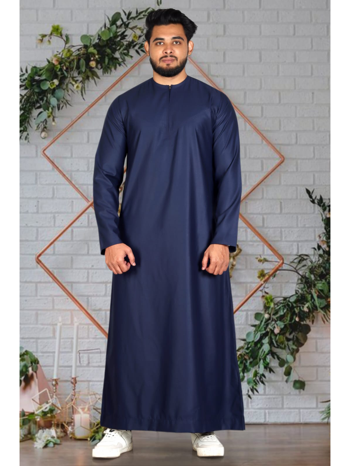 Navy Blue Matte Omani Thobe with Tassel by Qamar Clothing UK, a distinguished garment blending timeless tradition with contemporary sophistication. Skillfully crafted from premium materials, this thobe showcases a deep Navy Blue matte finish, adorned with a stylish tassel accent for added flair. Perfect for both casual and formal occasions, it exudes effortless elegance while ensuring comfort. Its durable fabric is easy to maintain, making this thobe a practical yet stylish choice for any wardrobe.