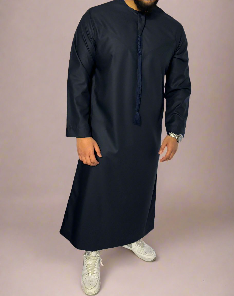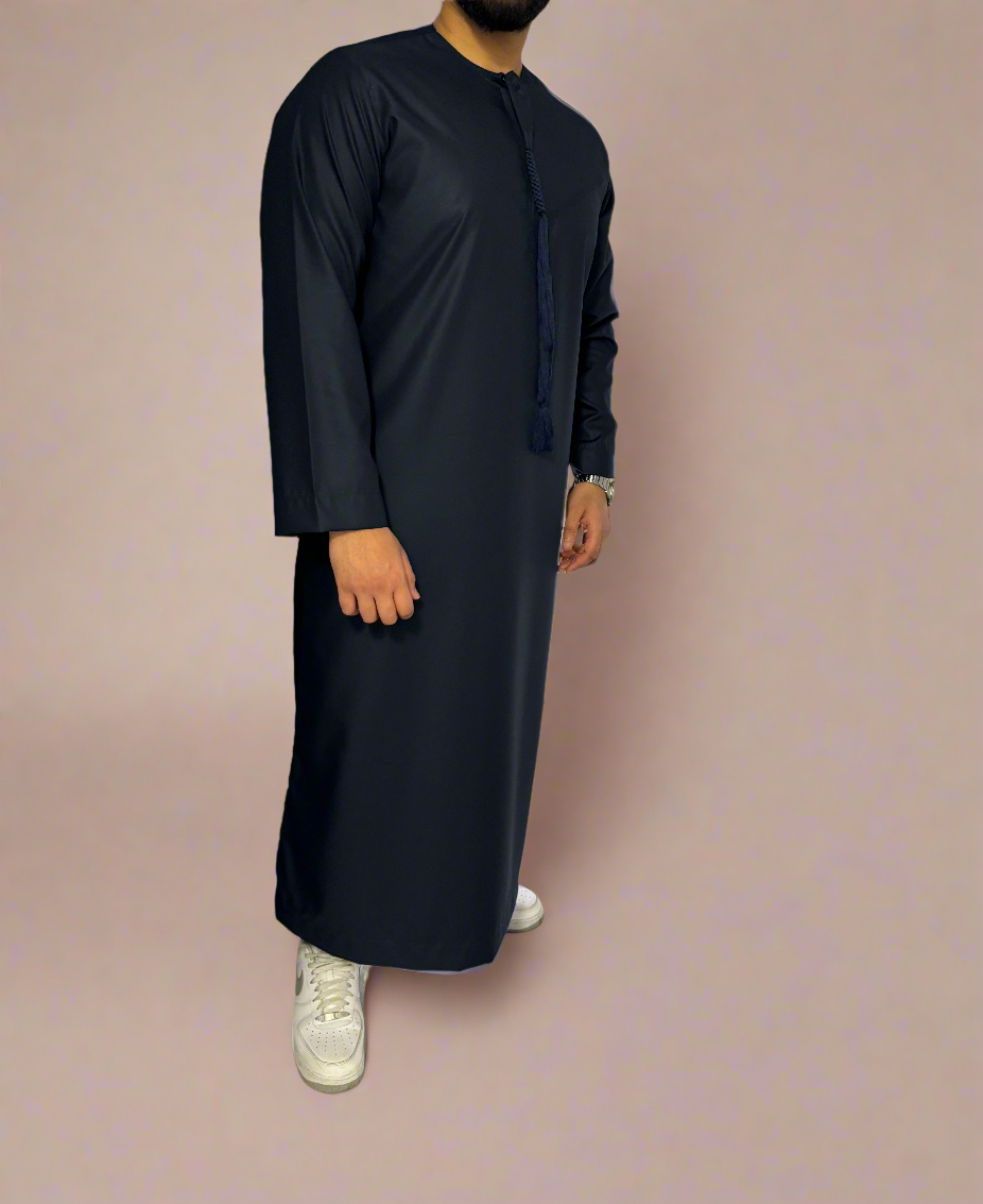 Midnight Matte Omani Thobe by Qamar Clothing UK, a timeless garment that seamlessly blends tradition with contemporary style. Crafted from premium 100% polyester, this thobe boasts a luxurious matte Midnight hue that exudes sophistication. Designed for casual wear, it offers both comfort and elegance in equal measure. Whether you're attending a gathering or simply going about your day, this thobe ensures you make a statement with its refined simplicity. Plus, with its machine washable fabric, caring for this garment is effortless, adding practicality to its charm.