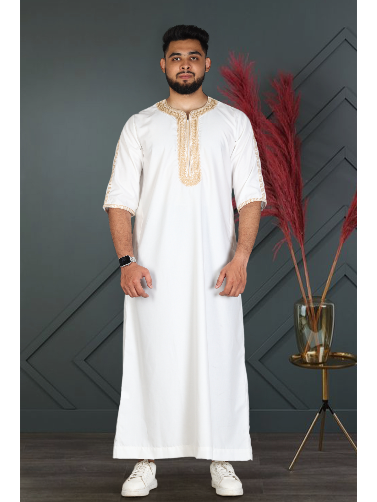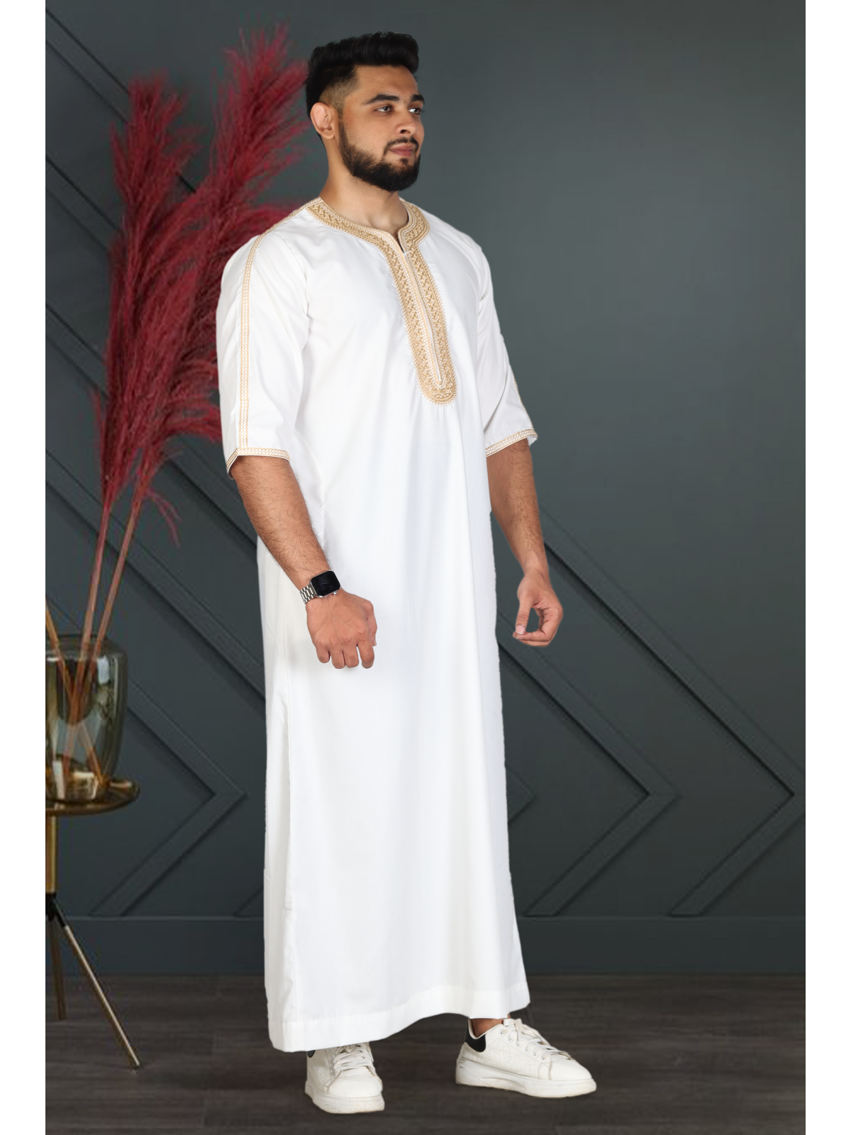 White Matte with Gold Embroidery Moroccan Style Thobe by Qamar Clothing UK, an exquisite ensemble harmonizing traditional Moroccan flair with contemporary finesse. Meticulously crafted from premium materials, this thobe boasts a pristine white matte finish accentuated by opulent gold embroidery, radiating sophistication and grace. Ideal for formal gatherings and special occasions, it ensures an enduring impression with its timeless elegance. Its resilient fabric is effortlessly cared for, presenting a blend of practicality and refined style, a must-have addition to your wardrobe.