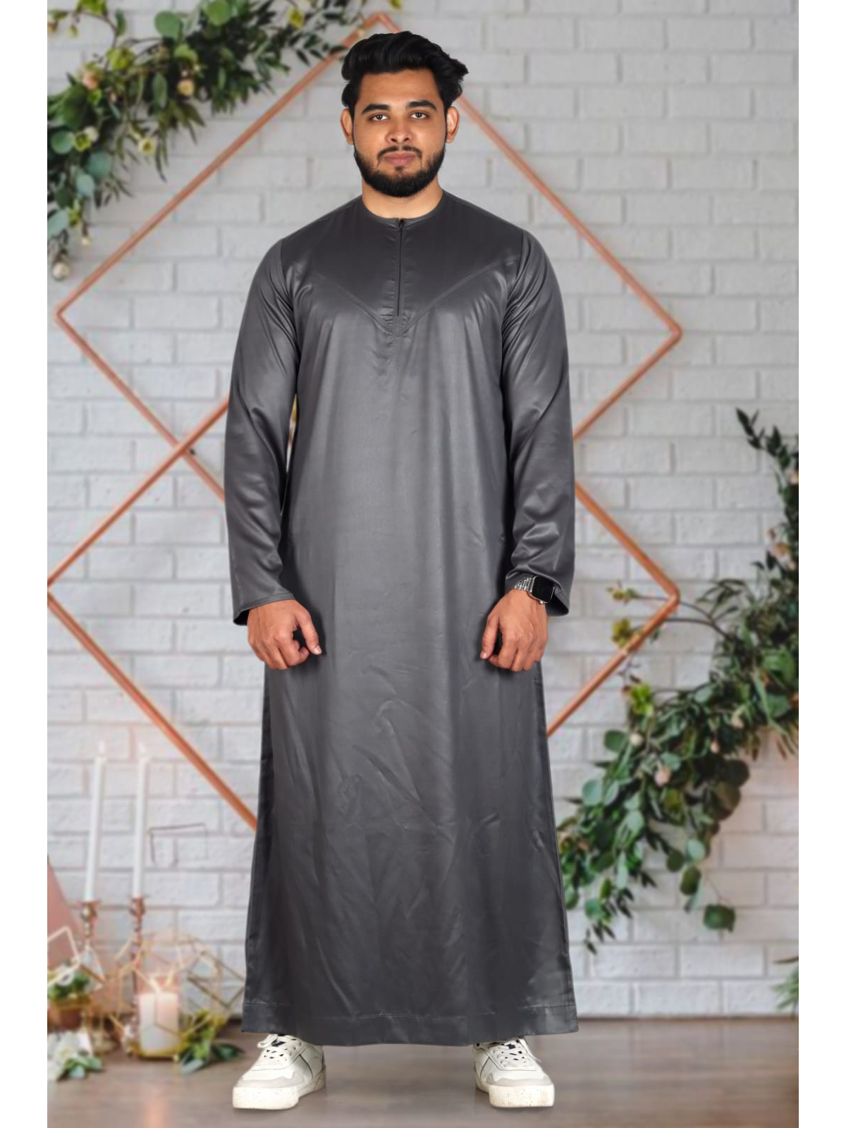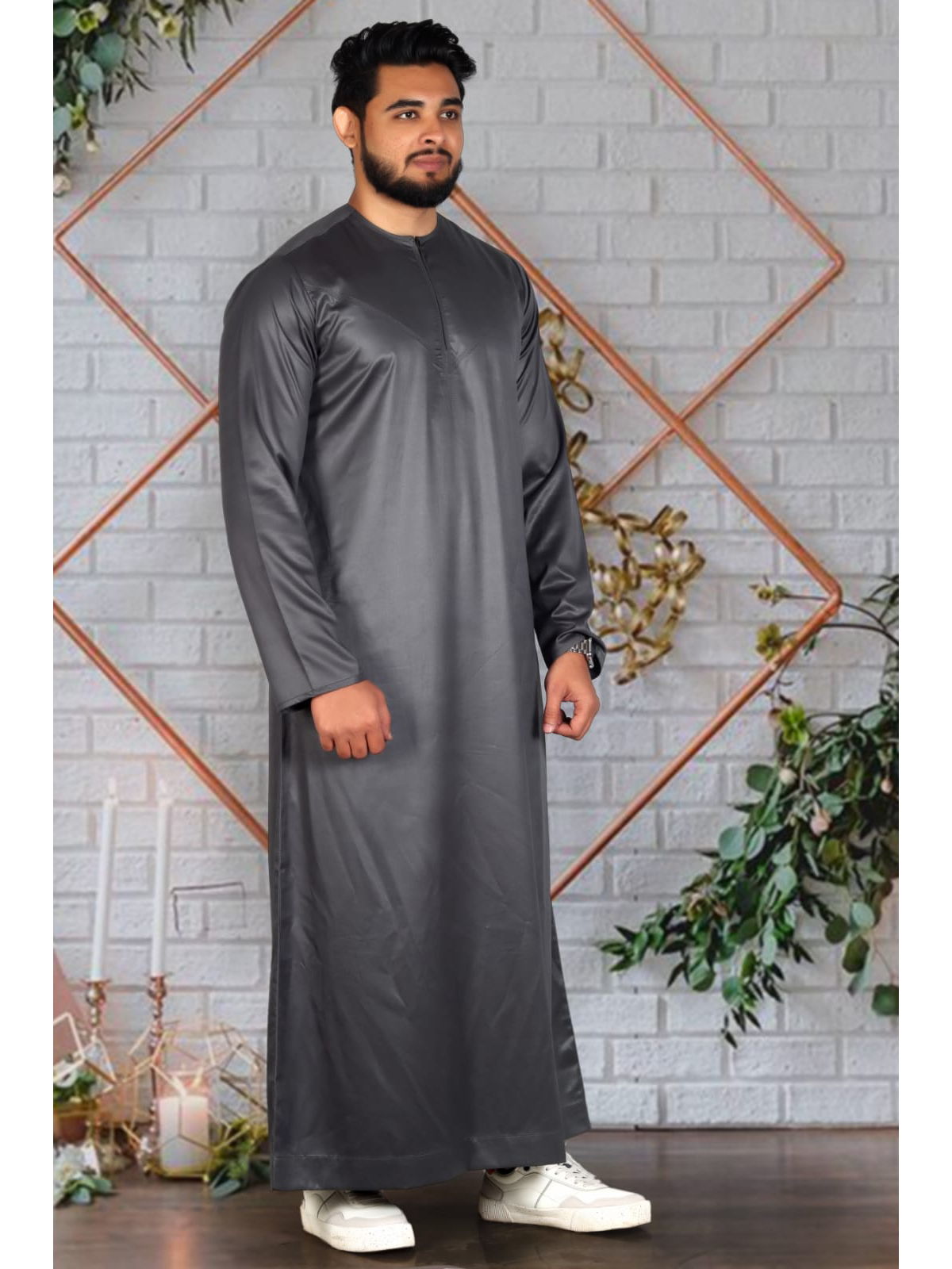 Charcoal Grey Silky Omani Thobe by Qamar Clothing UK, a stunning piece that combines traditional elegance with modern style. Crafted from high-quality polyester, this thobe features a sleek, shiny Charcoal Grey finish that radiates sophistication. Perfect for casual wear, it offers unparalleled comfort while ensuring you stand out with its unique shine. Its machine washable fabric makes it easy to care for, making this thobe a practical yet stylish addition to any wardrobe.