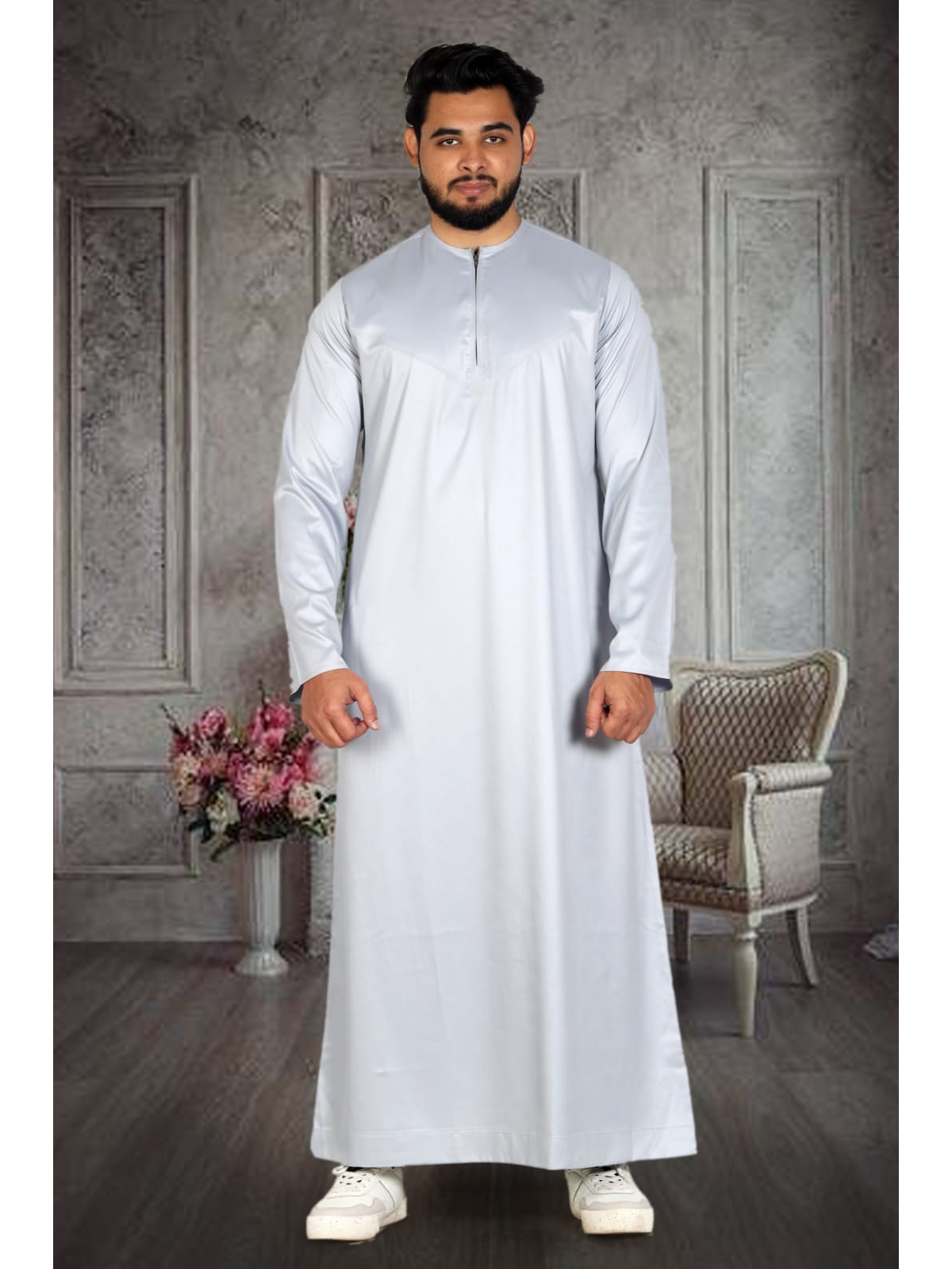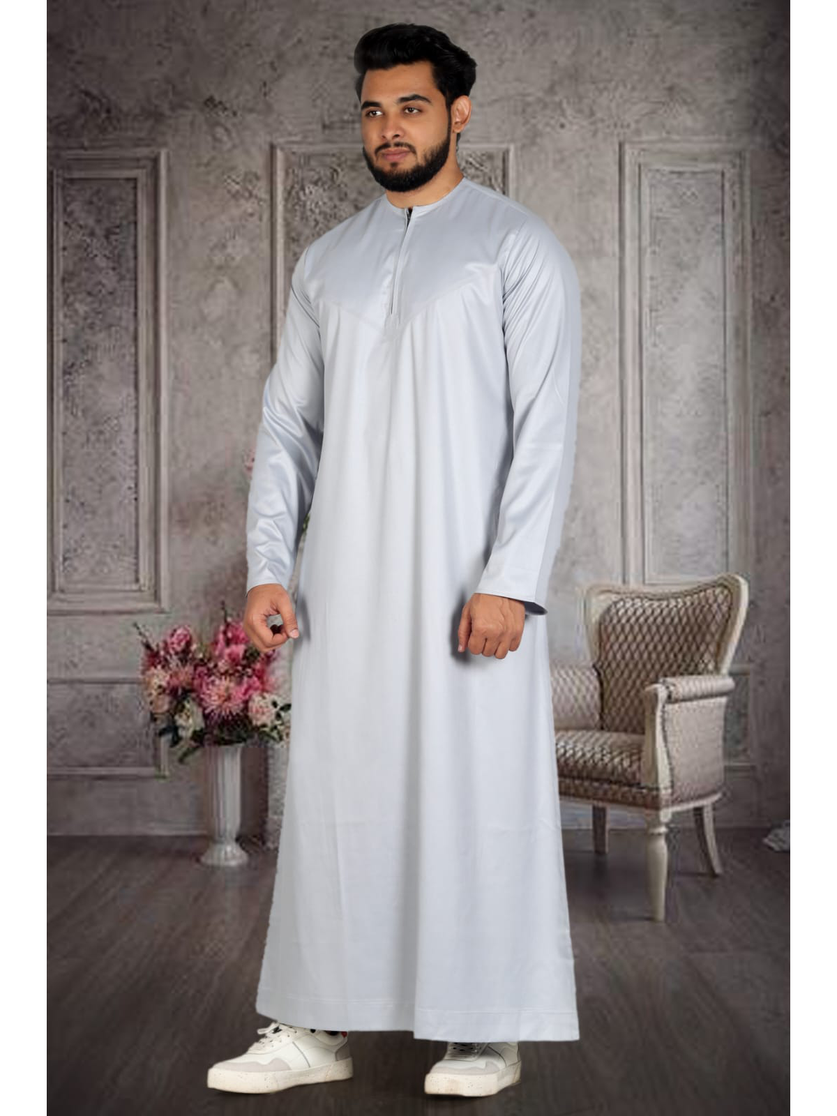 Silver Grey Silky Omani Thobe by Qamar Clothing UK, a stunning piece that combines traditional elegance with modern style. Crafted from high-quality polyester, this thobe features a sleek, shiny Silver Grey finish that radiates sophistication. Perfect for casual wear, it offers unparalleled comfort while ensuring you stand out with its unique shine. Its machine washable fabric makes it easy to care for, making this thobe a practical yet stylish addition to any wardrobe.