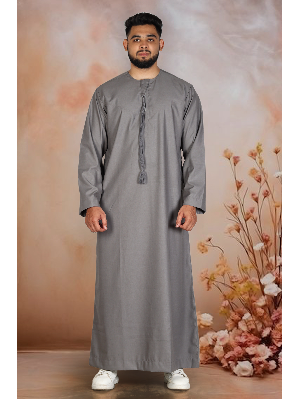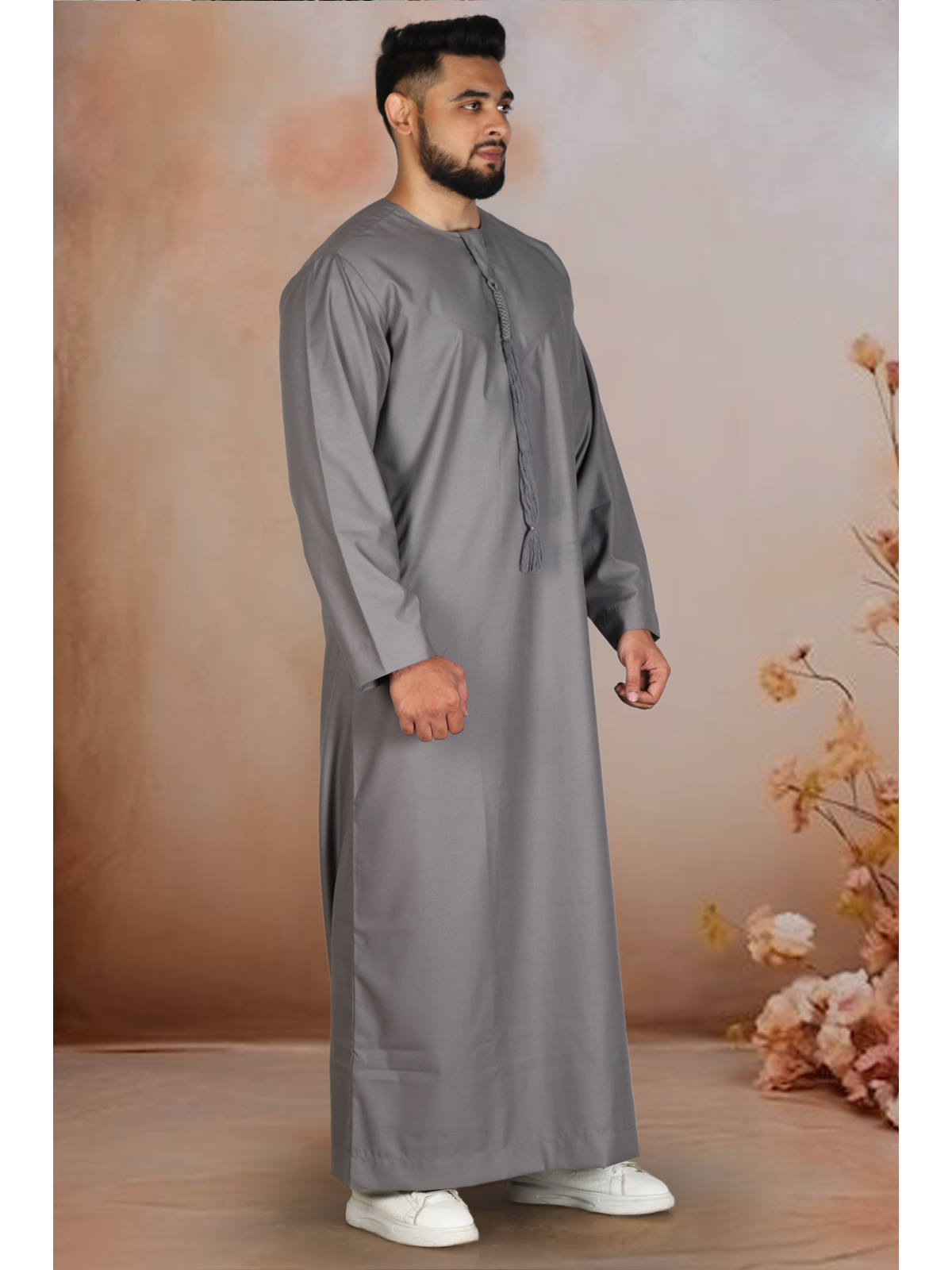 Grey Matte Omani Thobe with Tassel by Qamar Clothing UK, a distinguished garment blending timeless tradition with contemporary sophistication. Skilfully crafted from premium materials, this thobe showcases a deep grey matte finish, adorned with a stylish tassel accent for added flair. Perfect for both casual and formal occasions, it exudes effortless elegance while ensuring comfort. Its durable fabric is easy to maintain, making this thobe a practical yet stylish choice for any wardrobe.
