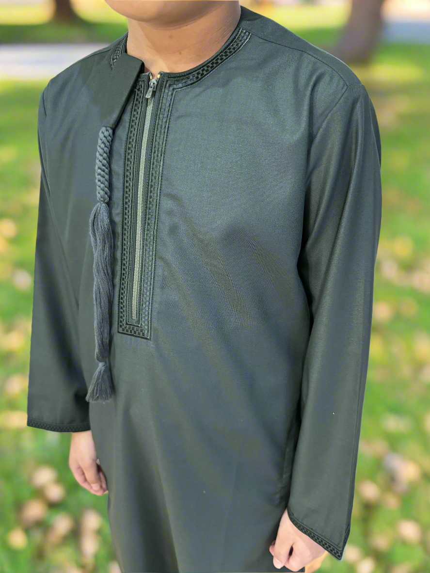 This elegant green thobe features intricate green embroidery stitching, adding a touch of luxury and sophistication. Made from high-quality fabric, it combines traditional design with a modern flair, perfect for special occasions or everyday wear. The rich green hue complements the delicate green accents, creating a striking yet timeless look. Comfortable, stylish, and meticulously crafted, this thobe is a must-have for those who appreciate refined fashion.