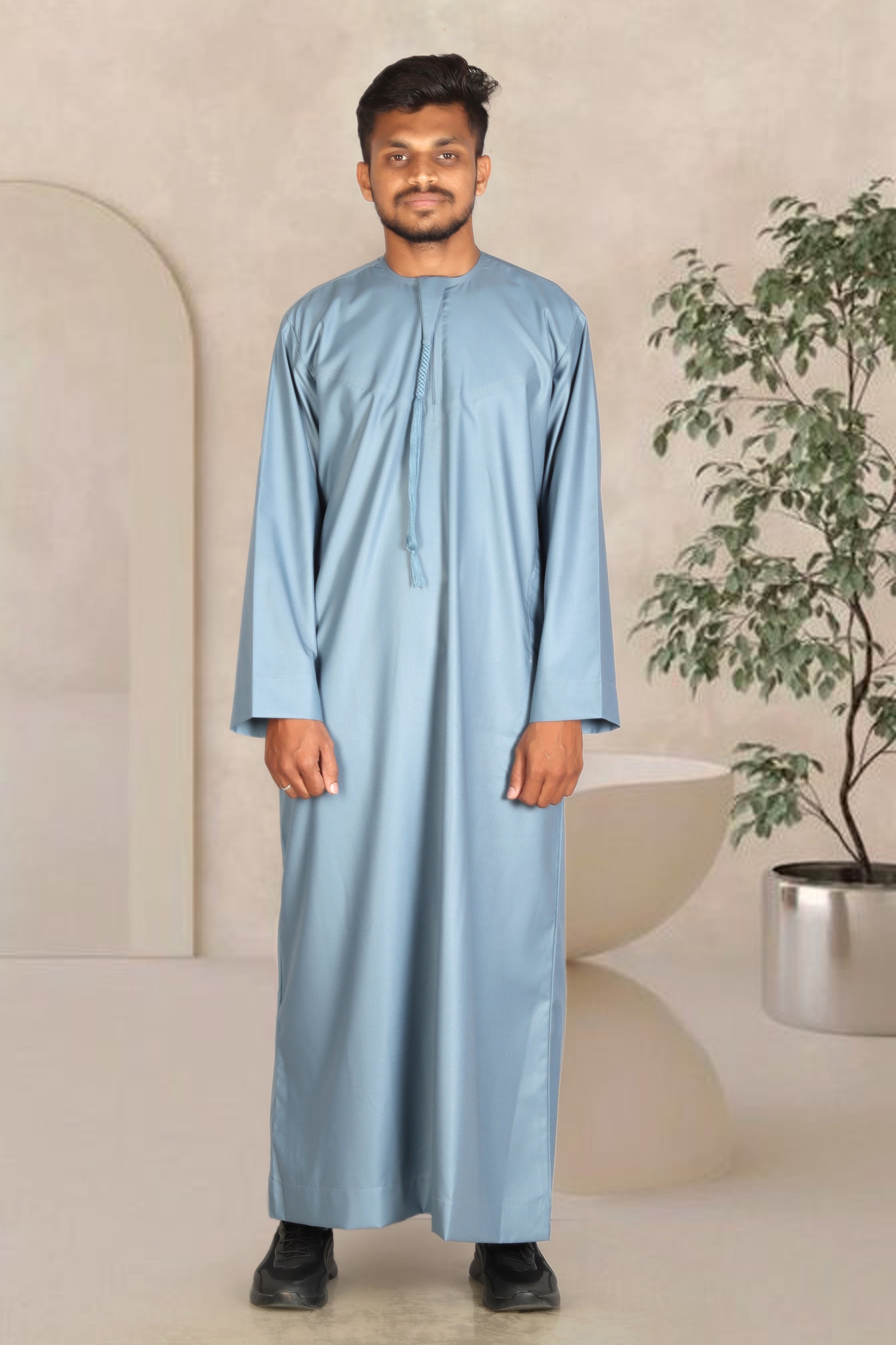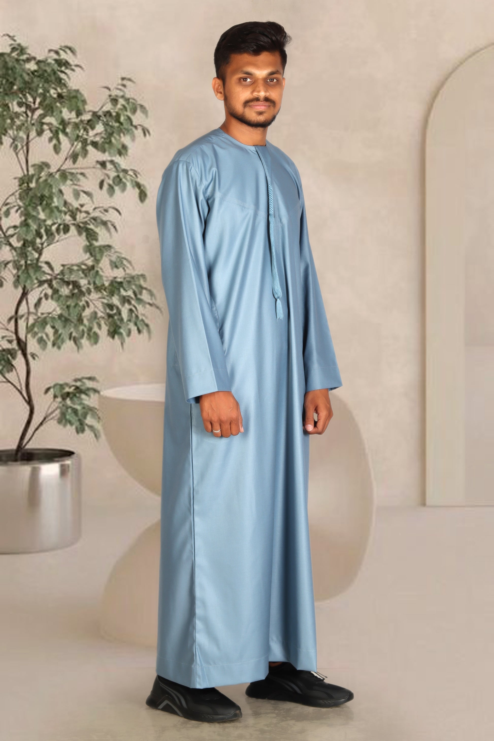 Blue Matte Omani Thobe by Qamar Clothing UK, a timeless garment that seamlessly blends tradition with contemporary style. Crafted from premium 100% polyester, this thobe boasts a luxurious matte Blue hue that exudes sophistication. Designed for casual wear, it offers both comfort and elegance in equal measure. Whether you're attending a gathering or simply going about your day, this thobe ensures you make a statement with its refined simplicity. Plus, with its machine washable fabric, caring for this garment is effortless, adding practicality to its charm.