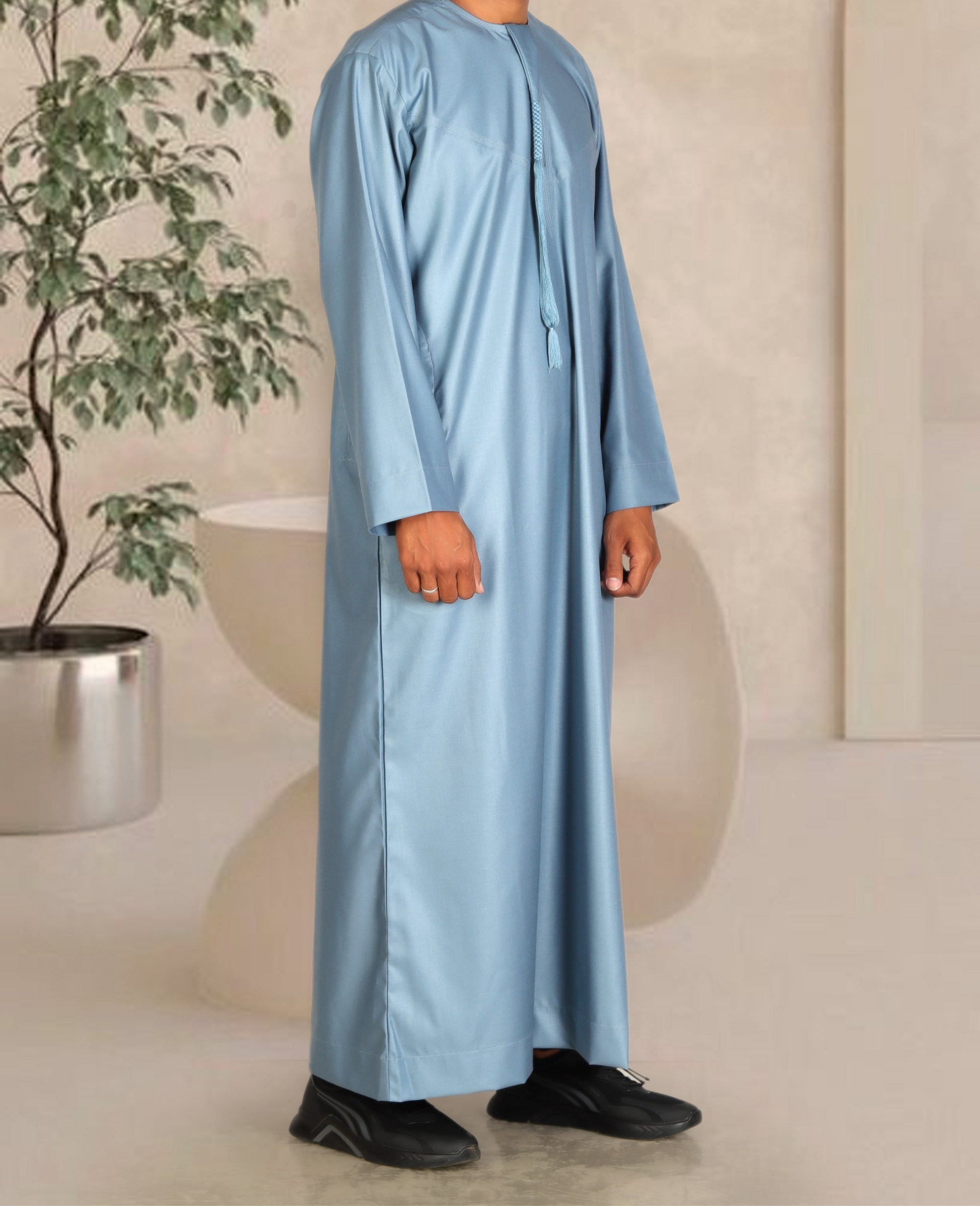 Blue Matte Omani Thobe by Qamar Clothing UK, a timeless garment that seamlessly blends tradition with contemporary style. Crafted from premium 100% polyester, this thobe boasts a luxurious matte Blue hue that exudes sophistication. Designed for casual wear, it offers both comfort and elegance in equal measure. Whether you're attending a gathering or simply going about your day, this thobe ensures you make a statement with its refined simplicity. Plus, with its machine washable fabric, caring for this garment is effortless, adding practicality to its charm.