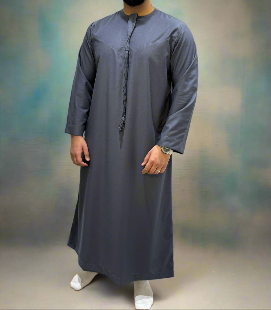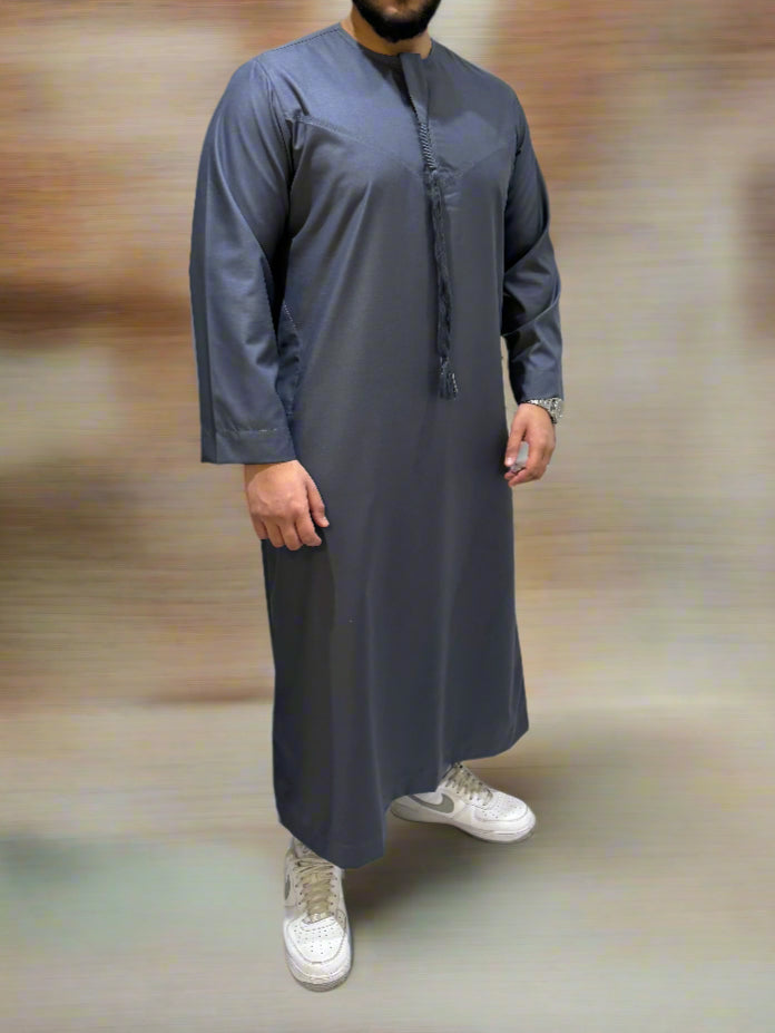 Dusty Blue Matte Omani Thobe with Tassel by Qamar Clothing UK, a distinguished garment blending timeless tradition with contemporary sophistication. Skilfully crafted from premium materials, this thobe showcases a light Dusty Blue matte finish, adorned with a stylish tassel accent for added flair. Perfect for both casual and formal occasions, it exudes effortless elegance while ensuring comfort. Its durable fabric is easy to maintain, making this thobe a practical yet stylish choice for any wardrobe.