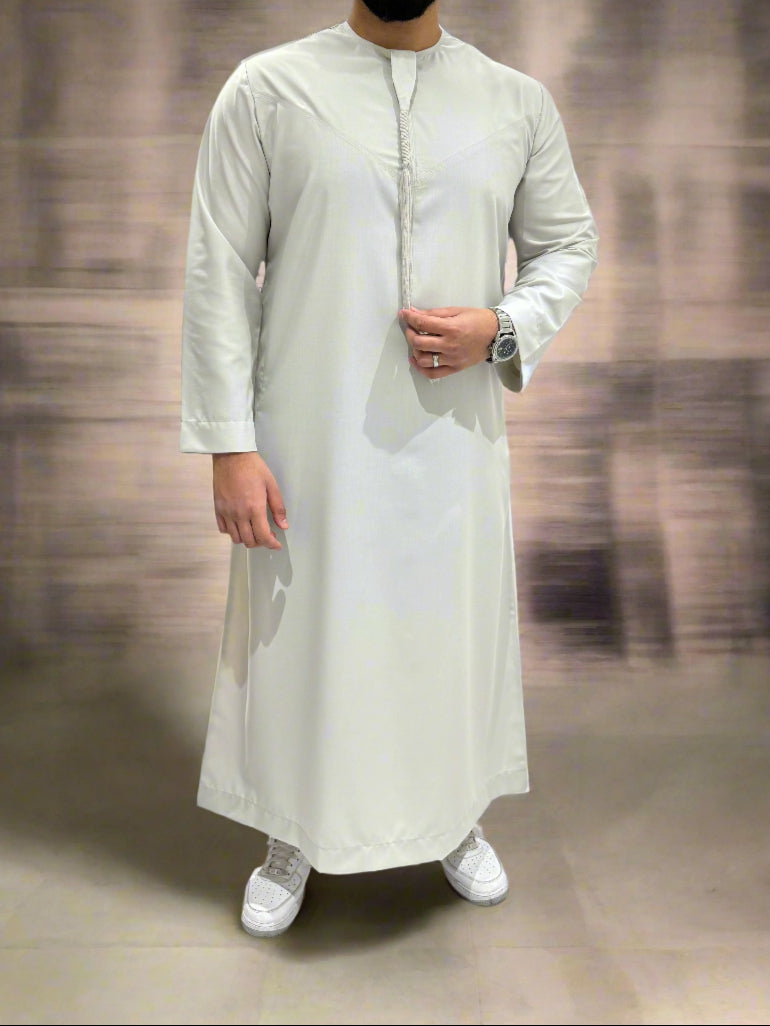 Pebble Matte Omani Thobe with Tassel by Qamar Clothing UK, a distinguished garment blending timeless tradition with contemporary sophistication. Skillfully crafted from premium materials, this thobe showcases a deep Pebble matte finish, adorned with a stylish tassel accent for added flair. Perfect for both casual and formal occasions, it exudes effortless elegance while ensuring comfort. Its durable fabric is easy to maintain, making this thobe a practical yet stylish choice for any wardrobe.