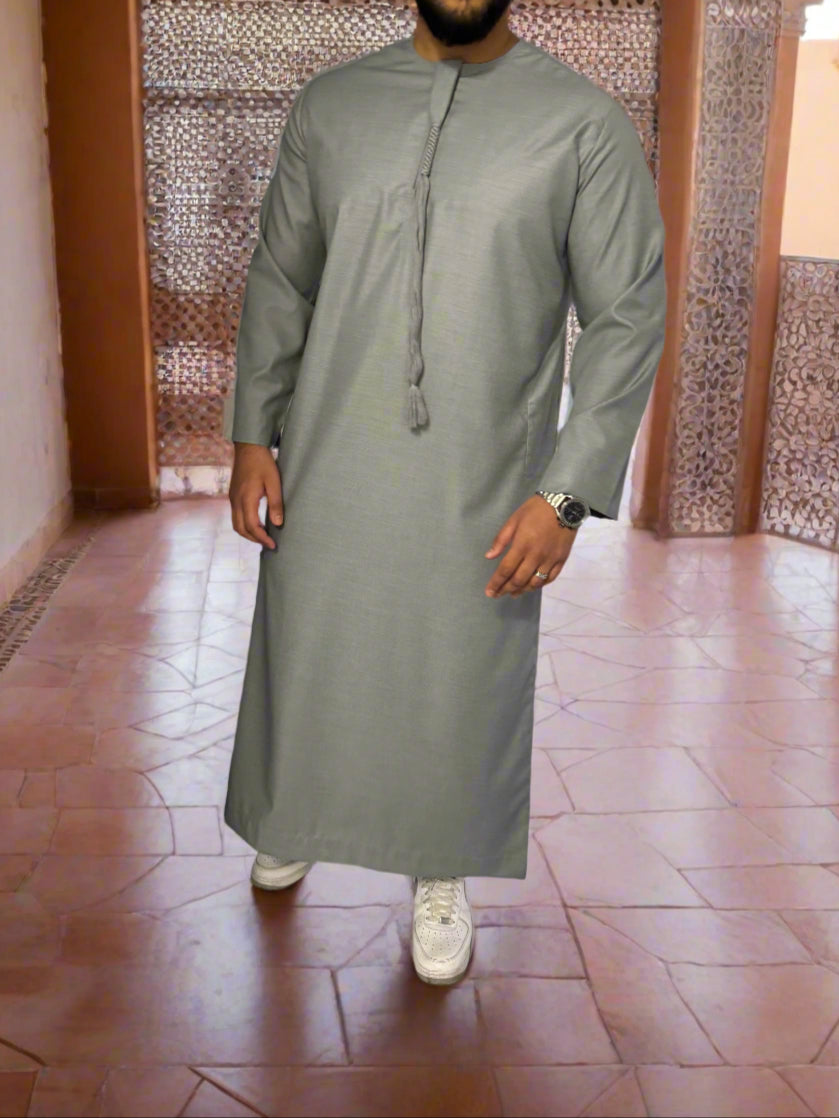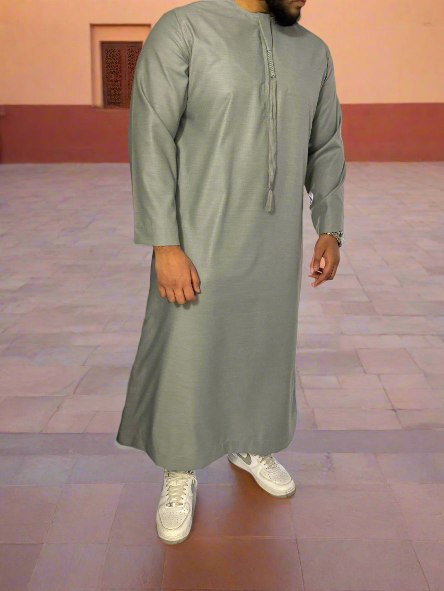 Silver grey Matte Omani Thobe by Qamar Clothing UK, a timeless garment that seamlessly blends tradition with contemporary style. Crafted from premium 100% polyester, this thobe boasts a luxurious matte Beige hue that exudes sophistication. Designed for casual wear, it offers both comfort and elegance in equal measure. Whether you're attending a gathering or simply going about your day, this thobe ensures you make a statement with its refined simplicity. Plus, with its machine washable fabric, caring for this garment is effortless, adding practicality to its charm.